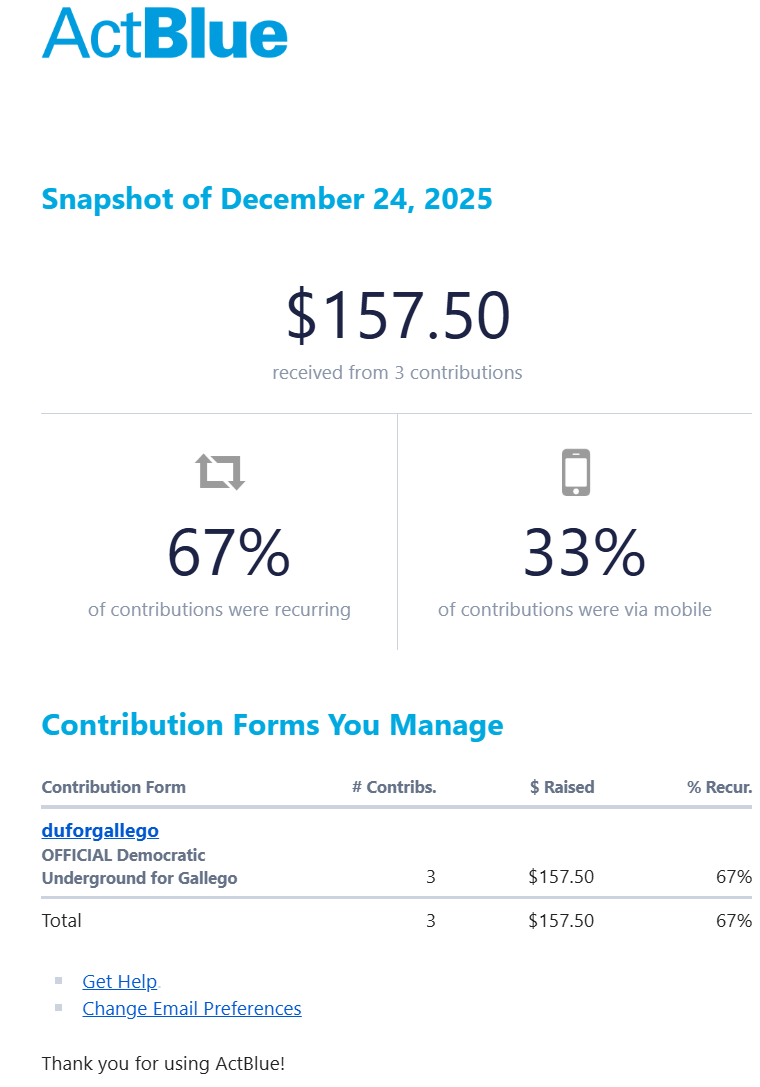 You raised $157.50 on December 24, 2025 @ ActBlue